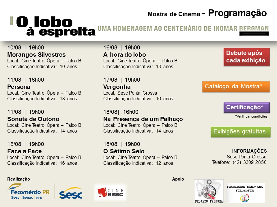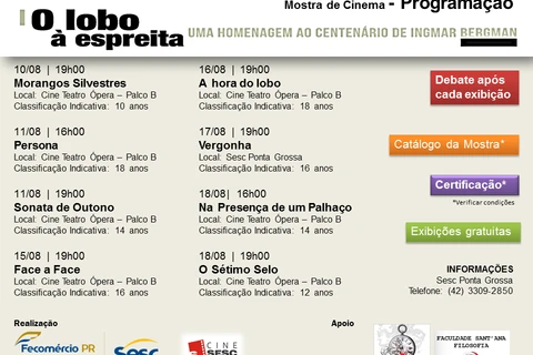 IMPRENSA/Ponta Grossa - Com o objetivo de debater a construção estética e o conteúdo da linguagem cinematográfica, Ponta Grossa irá conhecer melhor o mundo cinematográfico do diretor sueco Ingmar Bergman, que completaria 100 anos em 2018. Até o dia 18 de agosto serão oito sessões gratuitas, promovidas pelo projeto CineSesc, realizado pelo SESC, em parceria com o Projeto Fissura, coordenado pela Faculdade Sant'ana, com o apoio da Prefeitura de Ponta Grossa e da Fundação Municipal de Cultura.