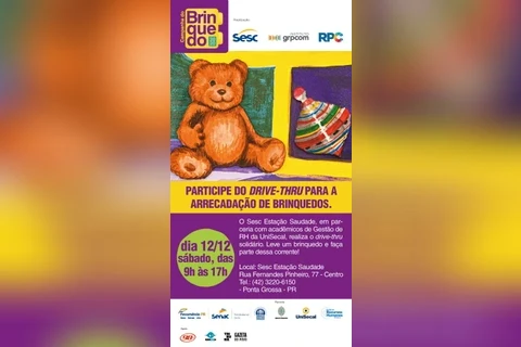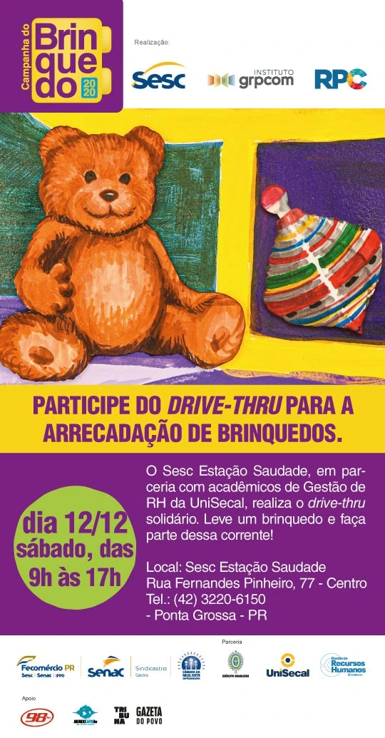 COM ASSESSORIAS - Com o objetivo de arrecadar brinquedos para a ‘Campanha do Brinquedo 2020’ do Sesc PR, o curso de Gestão de Recursos Humanos da UniSecal, em parceria com o Sesc Estação Saudade da cidade de Ponta Grossa (PR), realizará o ‘Drive-Thru Solidário’. A ação social acontecerá em 12 de dezembro, das 9h às 17h e qualquer pessoa poderá realizar as doações. Os donativos serão entregues para crianças em vulnerabilidade social.