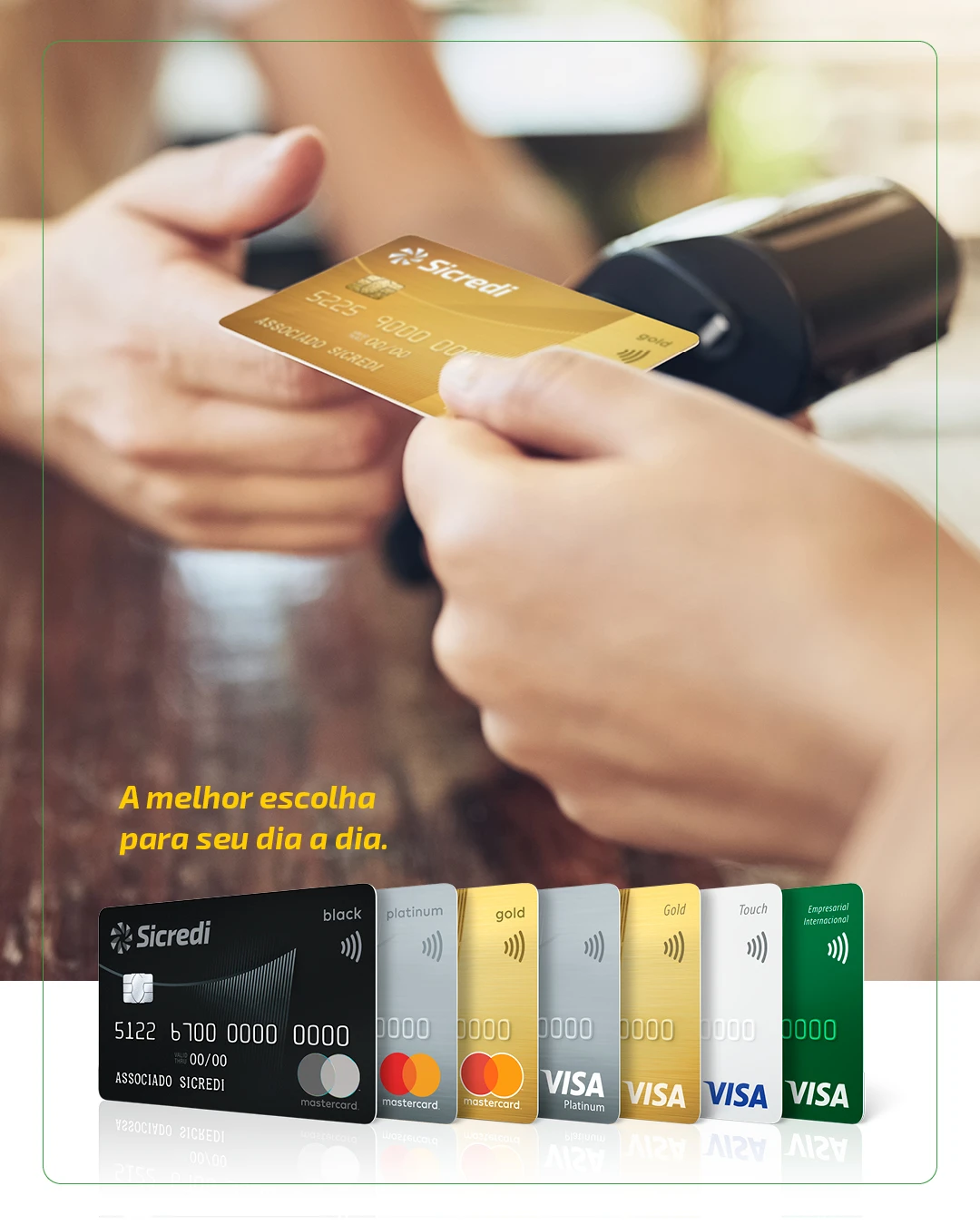 O Sicredi deu início ao negócio de emissão de cartões em 2001 e, ao longo dos quase 20 anos de atuação, a instituição tem disponibilizado aos seus associados um portfólio completo de soluções, tanto para pessoa física quanto jurídica. Além disso, vem investindo em canais digitais, buscando a melhor experiência e conveniência para seus associados. Em seus programas de recompensas, possibilita resgates via Latam Pass, TudoAzul, Smiles e em uma plataforma própria, com opções de produtos, serviços, viagens e Cashback em fatura.