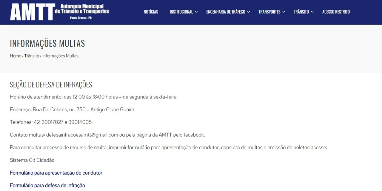 IMPRENSA/Ponta Grossa - A Autarquia Municipal de Trânsito e Transporte (AMTT) acaba de disponibilizar mais uma ferramenta para facilitar o acesso dos cidadãos a dados relacionados ao transporte e ao trânsito no município. Incluído entre os serviços do novo site da AMTT, o sistema de Gestão de Infrações de Trânsito (GIT Cidadão) possibilita a conferência detalhada da existência de multas, o acompanhamento de processos, além de disponibilizar o formulário de apresentação de condutor para preenchimento e a emissão de guias para pagamentos de multas.