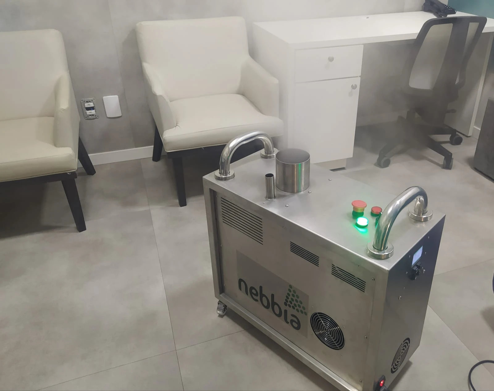 O dispositivo tem capacidade de transformar a solução saneante em gotículas que são pulverizadas no ambiente, atingindo todas as superfícies e inviabilizando patógenos existentes.