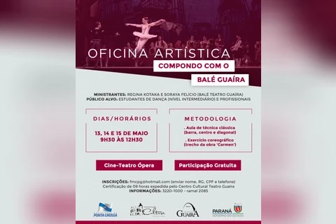 Já a oficina artística, intitulada ‘Compondo com o Balé Guaíra’, é voltada para estudantes de dança que estejam em nível intermediário e profissionais, e será ministrada por Regina Kotaka e Soraya Felício (ambas do Balé Teatro Guaíra). Serão realizadas aulas de técnica clássica (como barra, centro e diagonal) e exercícios coreográficos (recriando um trecho do repertório de 'Carmen', com exercício sugeridos pelo próprio coreógrafo da obra, Luiz Fernando Bongiovanni).