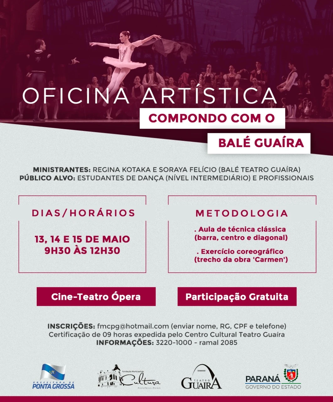 Os encontros também serão no Cine-Teatro Ópera, nos dias 13, 14 e 15 de maio (9h30 às 12h30), com participação gratuita. Após as atividades serão emitidos certificados aos participantes de nove horas expedidos pelo Centro Cultural Teatro Guaíra. Para se inscreverem nas oficinas os interessados devem encaminhar nome, RG, CPF e telefone para o email fmcpg@hotmail.com. As vagas são limitadas. Maiores informações estão disponíveis no telefone 3220-1000 - ramal 2085.