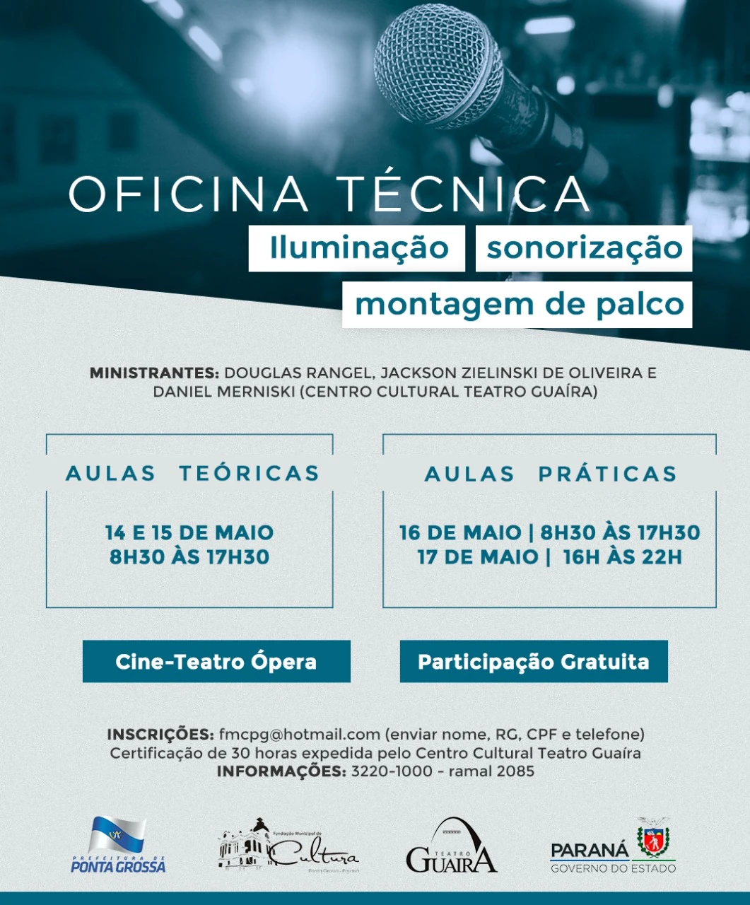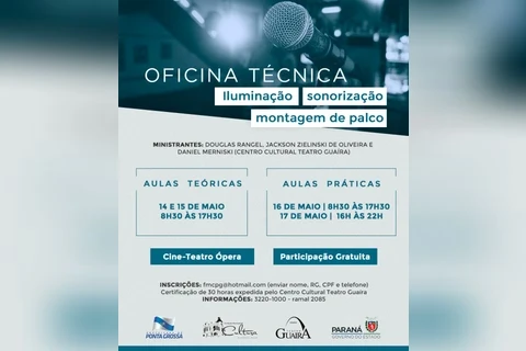 A oficina técnica será ministrada por Douglas Rangel, Jackson Zielinski de Oliveira e Daniel Merniski, com aulas teóricas nos dias 14 e 15 de maio (das 8h30 às 17h30) e práticas nos dias 16 (8h30 às 17h30) e 17 de maio (16h às 22h). As atividades serão no Cine-Teatro Ópera, com participação gratuita. Ao final serão emitidos certificados de 30 horas expedido pelo Centro Cultural Teatro Guaíra.