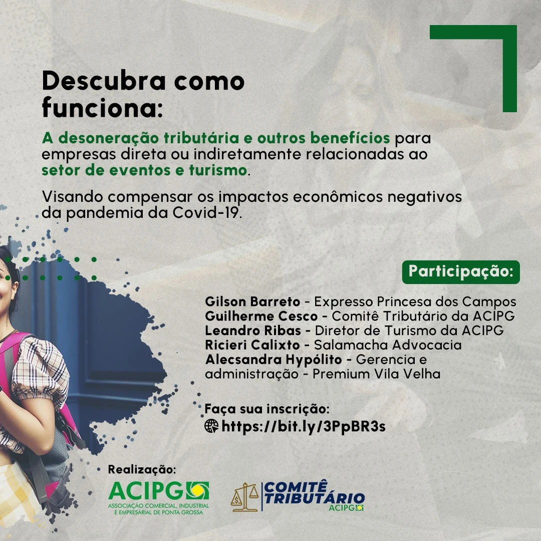 COM ASSESSORIAS - Você sabia que empresas setor de eventos e turismo podem participar de um programa de incentivos e isenção de impostos? O Programa Emergencial de Retomada do Setor de Eventos (PERSE) existe desde março deste ano e será tema de um evento que o Comitê Tributário da Associação Comercial, Industrial e Empresarial de Ponta Grossa (ACIPG) realiza no próximo dia 27. O encontro será uma oportunidade para empresários do setor de eventos e turismo saberem como o segmento pode se beneficiar de exonerações tributárias, em um momento de recuperação de prejuízos causados pela pandemia.