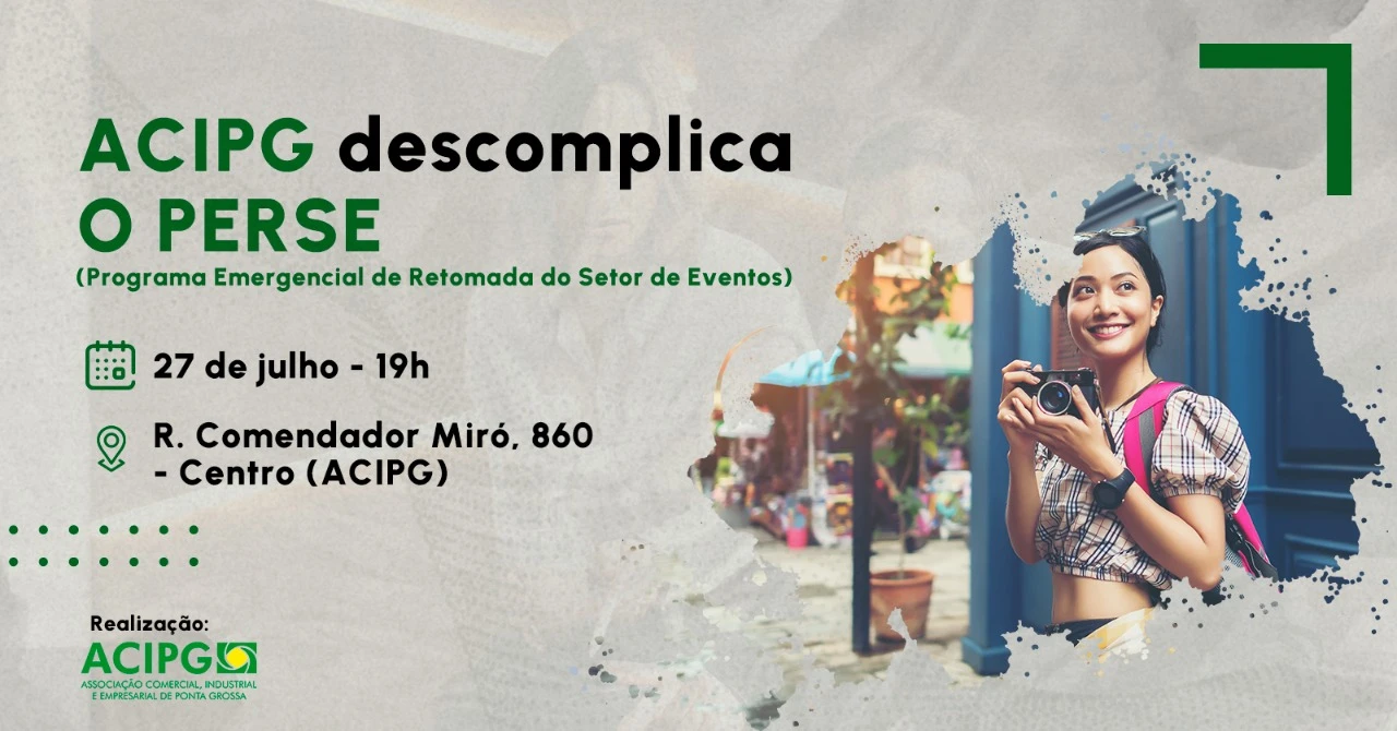 O "ACIPG descomplica o PERSE" irá reunir um time de especialistas para debater o Programa Emergencial de Retomada do Setor de Eventos, abordando o funcionamento a desoneração tributária e outros benefícios para empresas direta ou indiretamente relacionadas ao setor de eventos e turismo, visando compensar os impactos econômicos negativos da pandemia.