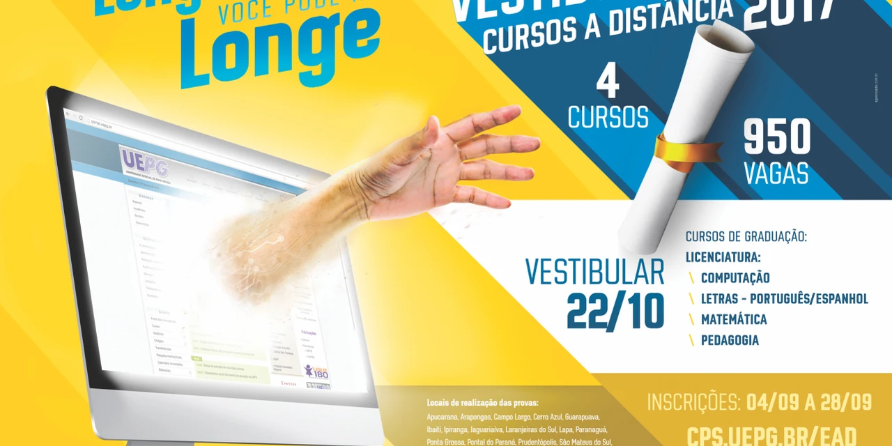 A Universidade Estadual de Ponta Grossa (UEPG) anuncia a abertura das inscrições para o Vestibular EaD 2017 para cursos a distância. Os interessados poderão se inscrever de 4 a 28 de setembro, no endereço www.cps.uepg.br/ead. O pagamento da taxa de inscrição (R$ 141,00) poderá ser efetuado até 29 de setembro, nas agências bancárias ou locais integrados ao sistema de cobrança por compensação bancária. As provas serão realizadas em 22 de outubro, em Apucarana; Arapongas; Campo Largo; Cerro Azul; Guarapuava; Ibaiti; Ipiranga; Jaguariaíva; Laranjeiras do Sul; Lapa; Paranaguá; Ponta Grossa; Pontal do Paraná; Prudentópolis; Sarandi; São Mateus do Sul e Umuarama.