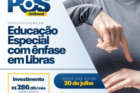 COM ASSESSORIAS - Direcionado para professores das redes pública e privada, Licenciados em Letras e Pedagogia, Gestores Educacionais e demais profissionais da educação, a UniSecal está oferecendo o curso de pós-graduação em Educação Especial com Ênfase em Libras. Com uma duração de 18 meses, a especialização em nível lato-sensu tem aulas presenciais, com o objetivo de formar profissionais especialistas na área da educação especial para a realização de práticas docentes e ações pedagógicas que respondam às demandas educacionais e contribuam para a formação da aprendizagem do aluno com deficiência. Além disso, ao final do curso, os alunos poderão realizar o exame de proficiência para receber a certificação de intérprete de Libras.
