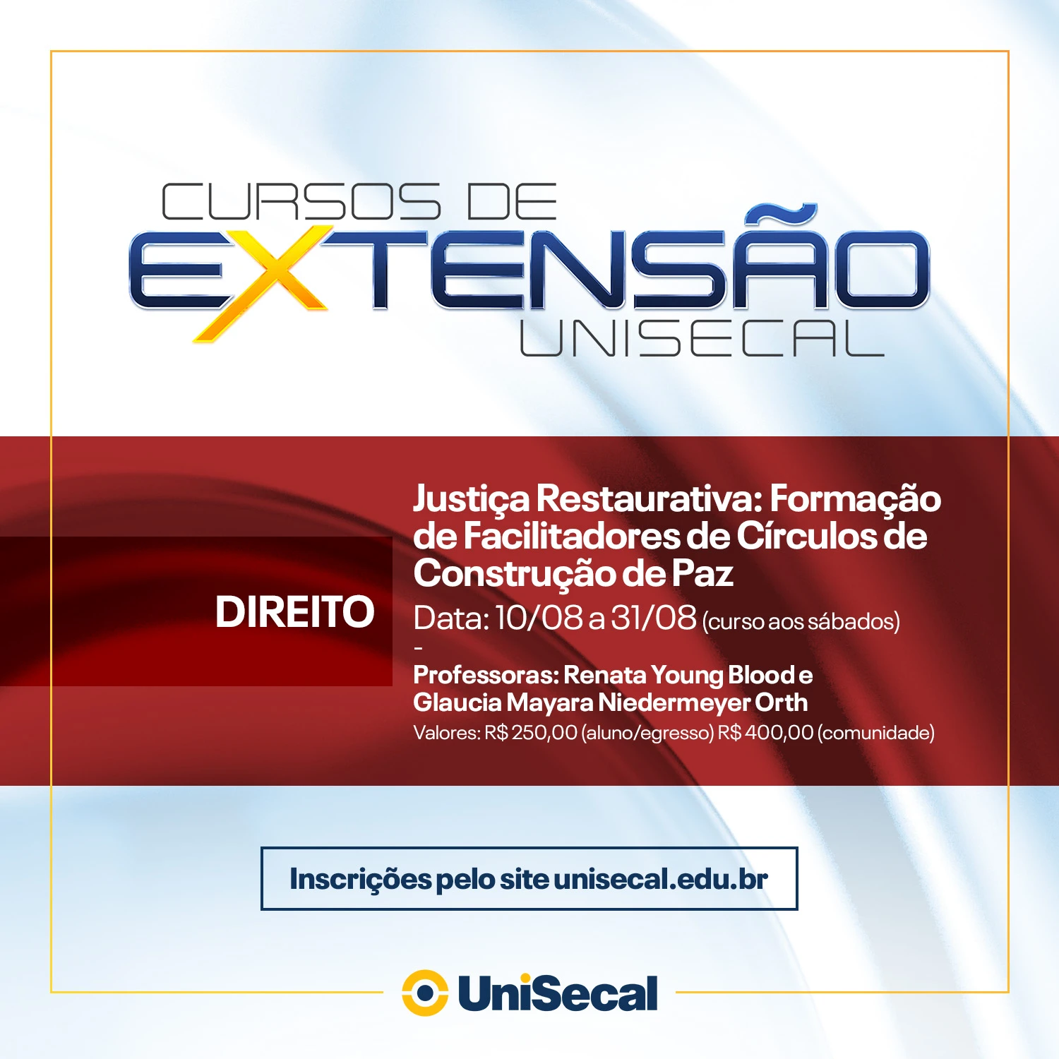 Coordenado pelas professoras Ma. Renata Young Blood e Dra. Glaucia Mayara Niedermeyer Orth, o curso de extensão tem como objetivo formar facilitadores de círculos de construção de paz, os quais são utilizados para resolução de conflitos e/ou fortalecimento de vínculos. De acordo com Renata, no decorrer das aulas os participantes aprenderão cinco temas. “O curso alia teoria e prática de forma vivencial. Portanto, os alunos estudarão introdução às práticas restaurativas, círculo de construção de paz, conceitos, princípios, fundamentos e valores, prática de construção de círculos e, não menos importante, procedimentos circulares”, explica a também coordenadora do curso de Direito da UniSecal.