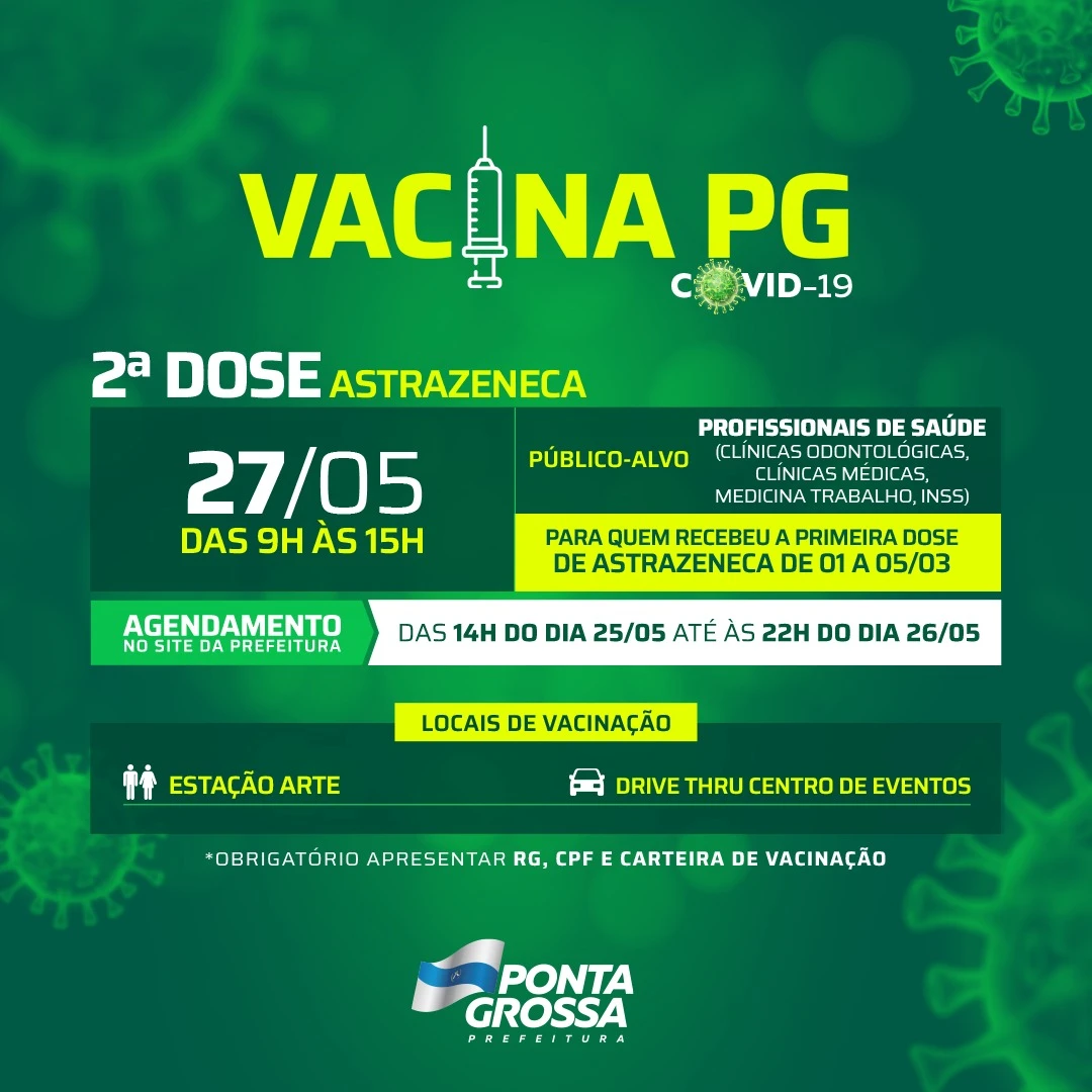 https://www.pontagrossa.pr.gov.br/) a partir das 14h de hoje (25) e segue até às 22h de amanhã (26). O público será imunizado na Estação Arte e no Centro de Eventos.