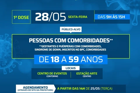 Na sexta-feira (28) a FMS continuará vacinando com primeira dose (D1) gestantes e puérperas com comorbidades, síndrome de down, inscritos no Benefício de Prestação Continuada (BPC), todos com idade entre 18 e 59 anos e munidos da declaração que comprove a comorbidade. Esse agendamento também será aberto hoje e segue até quinta-feira ou enquanto durarem as doses.