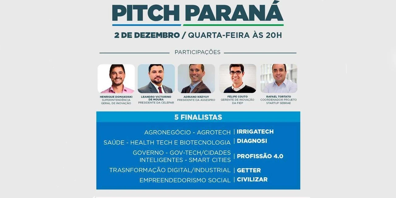 Após cinco rodadas de apresentações de soluções inovadoras que contribuam para o desenvolvimento estadual, a startup vencedora do Pitch Paraná será conhecida nesta quarta-feira (02). Estão na disputa IrrigaTech, finalista na categoria Agronegócio; Diagnosi, da área de Saúde e Biotecnologia; Profissão 4.0, de Governo e Cidades Digitais; Getter, na categoria Indústria 40; e Civilizar, vencedora tema Empreendedorismo Social.