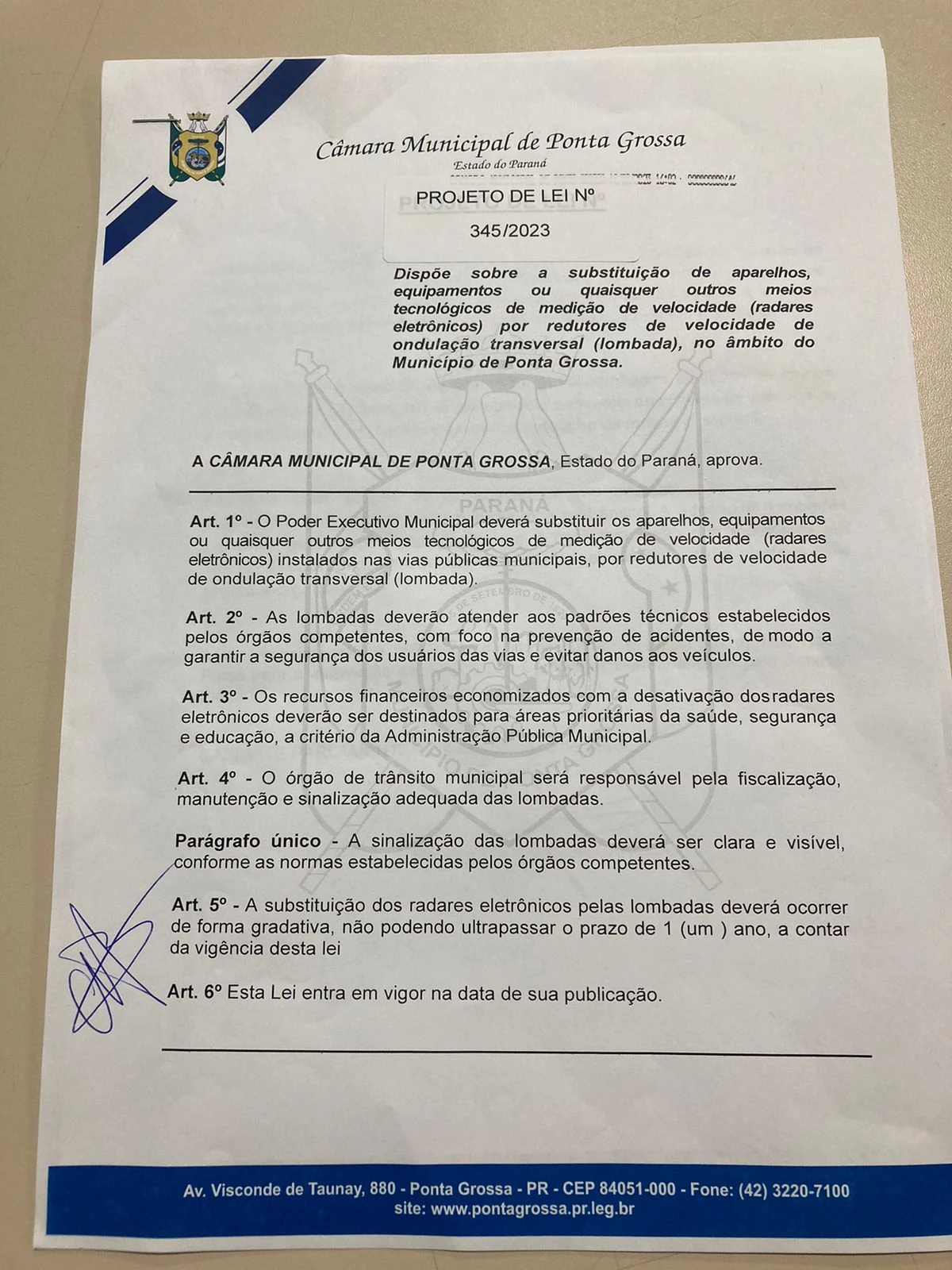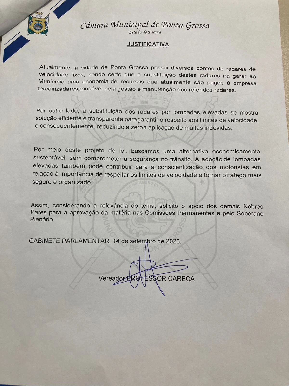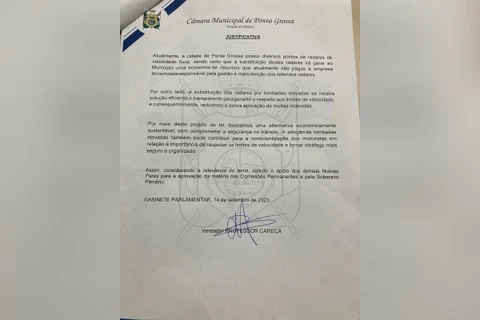 De acordo com Careca, a iniciativa visa trocar os radares por lombadas elevadas. "Esse projeto de lei irá gerar ao município de Ponta Grossa uma economia de recursos que atualmente são pagos a empresa terceirizada responsável pela gestão e manutenção dos referidos radares, além de reduzir a zero a aplicação das multas indevidas", destaca o parlamentar.