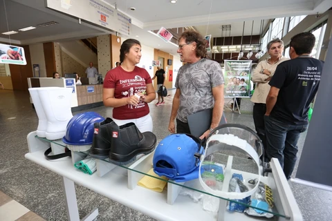 IMPRENSA/Ponta Grossa - Ontem (2), quem passou pela Prefeitura Municipal de Ponta Grossa (PMPG) se deparou com uma cena atípica logo na entrada. Fotos de acidente de trabalho, registradas na cidade e região, foram expostas. Técnicos da Vigilância Sanitária Municipal (Visa) estavam espalhados na praça de atendimento, orientando e conscientizando as pessoas que passavam sobre segurança de trabalho.