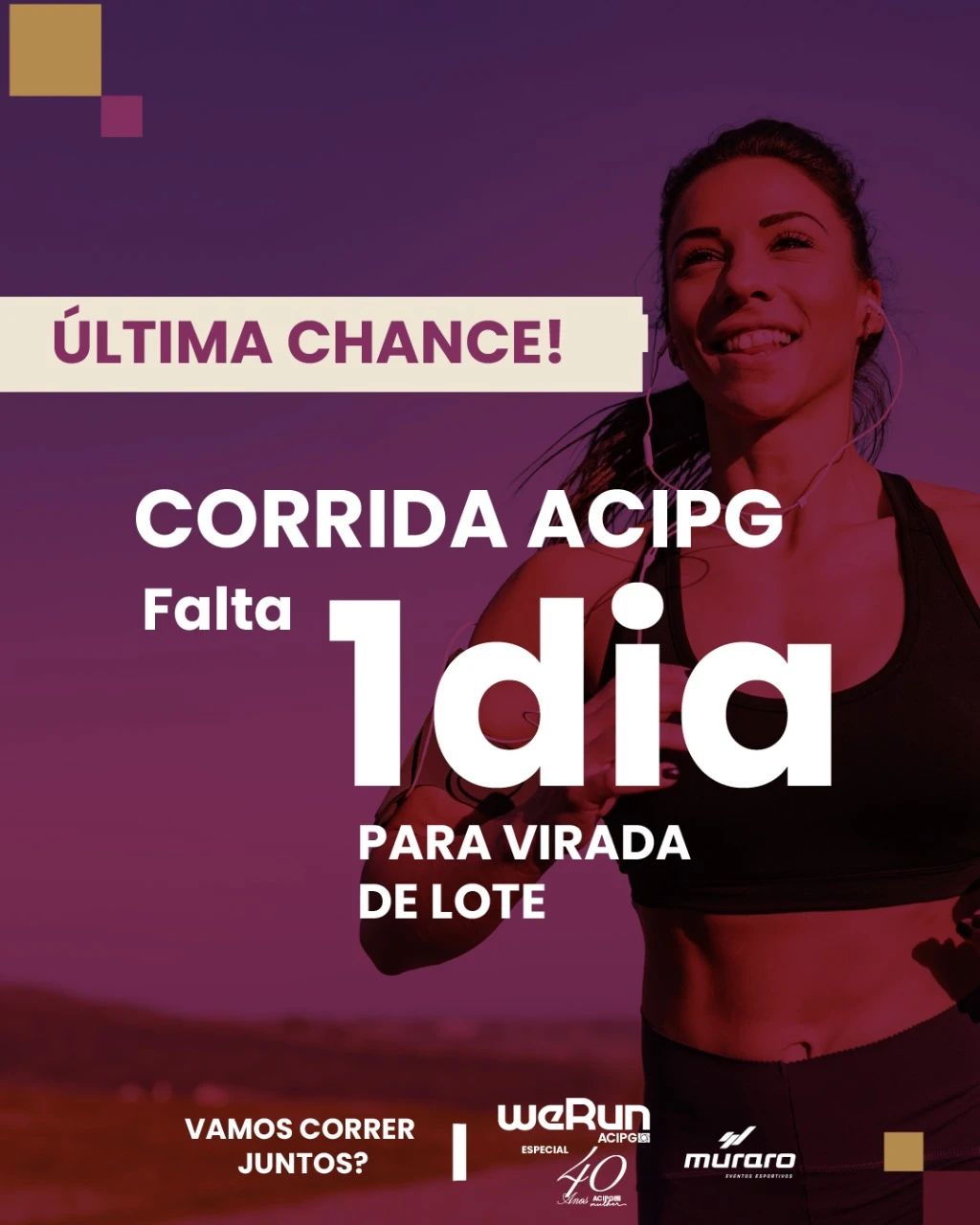 COM ASSESSORIAS - Corre que ainda dá tempo! A Associação Comercial, Industrial e Empresarial de Ponta Grossa (ACIPG) avisa que o prazo do primeiro lote promocional da corrida "Corremos Juntos ACIPG" termina nesta quarta-feira (14) – após essa data, os valores mudam. Com 500 inscritos confirmados nas modalidades de 5 km, 10 km, caminhada e corrida kids, o evento promete movimentar a cidade no dia 15 de junho, celebrando os 40 anos da ACIPG Mulher.