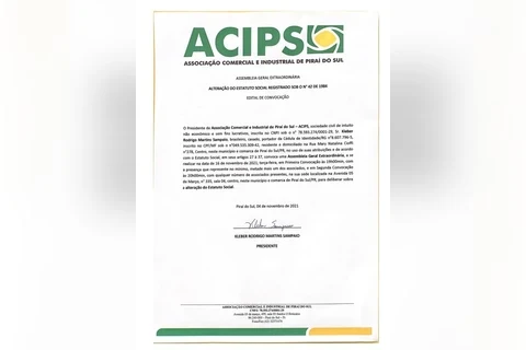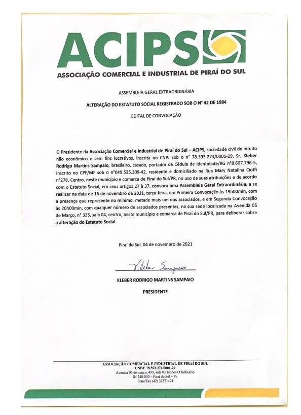O Presidente da Associação Comercial e Industrial de Piraí do Sul - ACIPS, sociedade civil de intuito não econômico e sem fins lucrativos, inscrita no CNPJ sob o nº 78.593.274/0001-29, Sr. Kleber Rodrigo Martins Sampaio, brasileiro, casado, portador da Cédula de Identidade/RG nº 8.607.796-5, inscrito no CPF/MF sob o nº 049.535.309-42, residente e domiciliado na Rua Mary Natalina Cioffi, nº 278, Centro, neste município e comarca de Piraí do Sul/PR, no uso de suas atribuições e de acordo com o Estatuto Social, em seus artigos 27 à 37, convoca uma Assembleia Geral Extraordinária, a se realizar na data de 16 de novembro de 2021, terça-feira, em Primeira Convocação às 19h00min, com a presença que represente no mínimo, metade mais um dos associados, e em Segunda Convocação às 20h00min, com qualquer número de associados presentes, na sua sede localizada na Avenida 05 de Março, nº 335, sala 04, centro, neste município e comarca de Piraí do Sul/PR, para deliberar sobre a alteração do Estatuto Social.