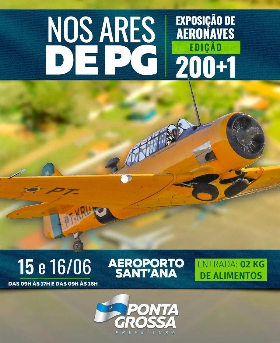 COM ASSESSORIAS - O Aeroporto Municipal de Ponta Grossa – Comandante Antônio Amilton Beraldo (Aeroporto Sant’Ana) vai realizar nos dias 15 e 16 de junho mais uma edição do evento “Nos Ares de PG”. A abertura das atividades está programada para sábado (15), às 9 horas, no Aeroporto. A programação terá uma série de atrações, como exposição de aviões, sobrevoos de aeronaves e saltos de paraquedas. No local haverá também uma exposição de caminhões clássicos retrô do Corpo de Bombeiros. O ingresso é 2 kg de alimento não perecível.