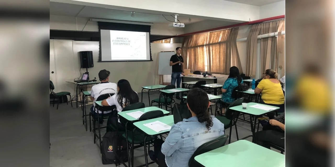 A capacitação engloba a parte teórica sobre o escorpião e a parte prática, onde é realizada uma busca-ativa nas residências que possam ter o aracnídeo.