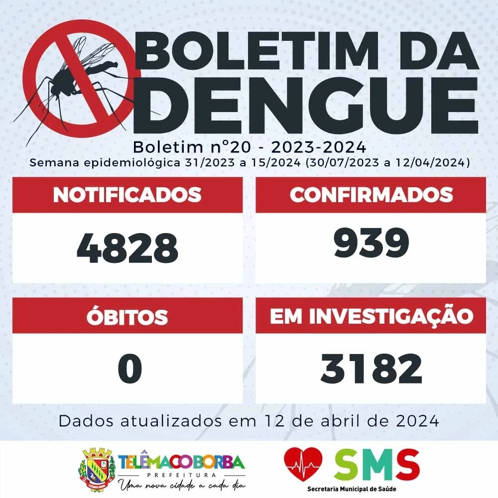 Ainda de acordo com o Boletim nº 20, que vai de 30 de julho de 2023 e 12 de abril de 2024, foram notificadas 4.828 pessoas e mais 3.182 casos estão em investigação, aguardando saber se serão confirmados ou não.