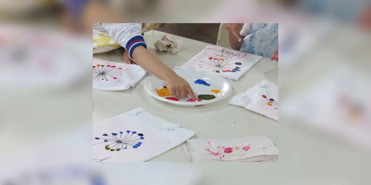 Na sequência, elas foram encaminhadas para a iniciação da oficina de pintura à mão livre, quando puderam vivenciar a experiência do toque na tinta e na textura do tecido.