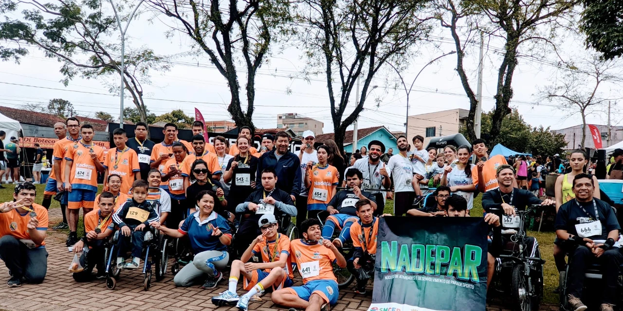 COM ASSESSORIAS - Um grupo de aproximadamente 40 pessoas, entre atletas PCDs e stafs, pertencentes ao Nadepar (Núcleo de Atividades e Desenvolvimento do Paradesporto) e Atitude (Associação das Pessoas com Deficiência de Telêmaco Borba), participaram no domingo (23) da 1ª edição da “Corrida 26° Batalhão”, promovida pelo 26° Batalhão de Policia Militar.
