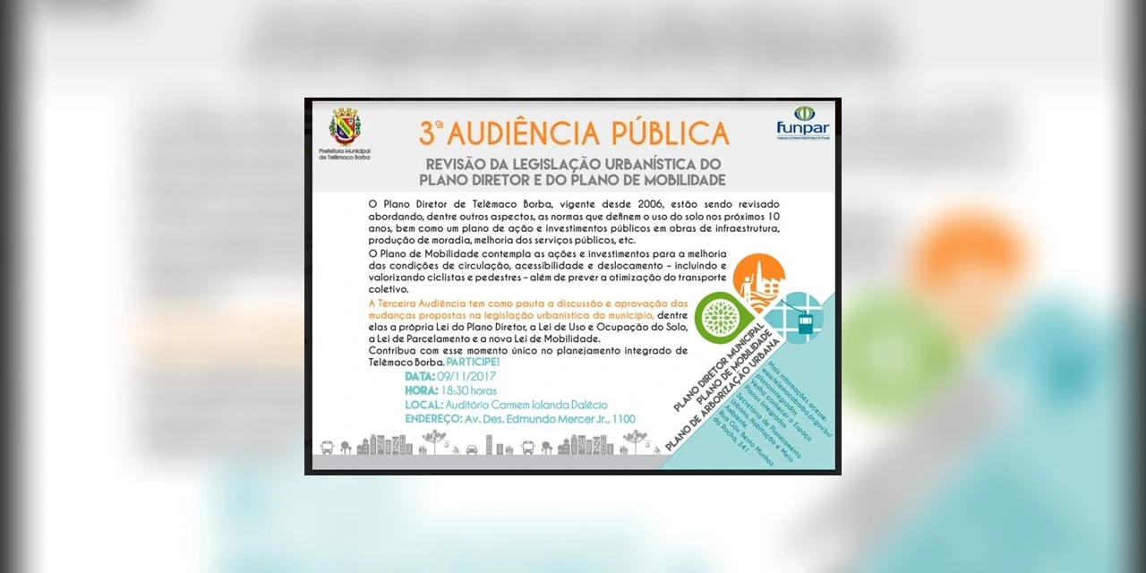 A Prefeitura de Telêmaco Borba e a Funpar – Fundação da Universidade Federal do Paraná promovem no dia 09 de novembro (quinta-Feira) a terceira e última Audiência Pública dos Planos Integrados do Município de Telêmaco Borba, na qual serão apresentadas as propostas de revisão da legislação urbanística e da nova lei de mobilidade. O evento acontecerá no Auditório Professora Carmem Iolanda Dalécio da Secretaria Municipal de Educação com início às 18h30.