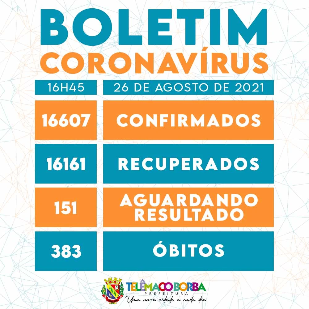 COM ASSESSORIAS - O Comitê Intersetorial de Enfrentamento ao COVID-19 (COMCOVID-19) informa que em Telêmaco Borba, no dia 26 de agosto, existem 16607 casos confirmados de COVID-19 na cidade, sendo que destes, 16161 já receberam alta médica e 383 casos vieram a óbito. Ainda existem 151 pessoas aguardando resultado.