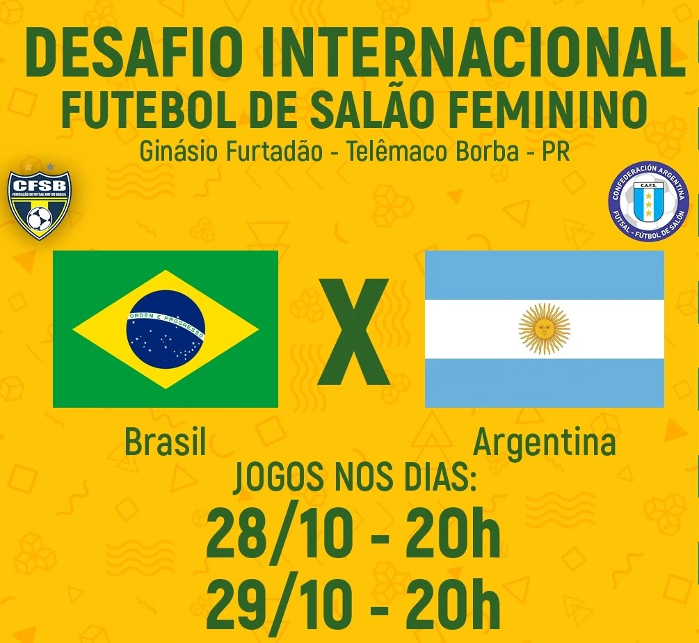 COM ASSESSORIAS - As seleções do Brasil e Argentina se enfrentam neste fim de semana, sexta (28) e sábado (29), no Ginásio Furtadão, em Telêmaco Borba, no Desafio Internacional de Futebol de Salão Feminino Adulto.