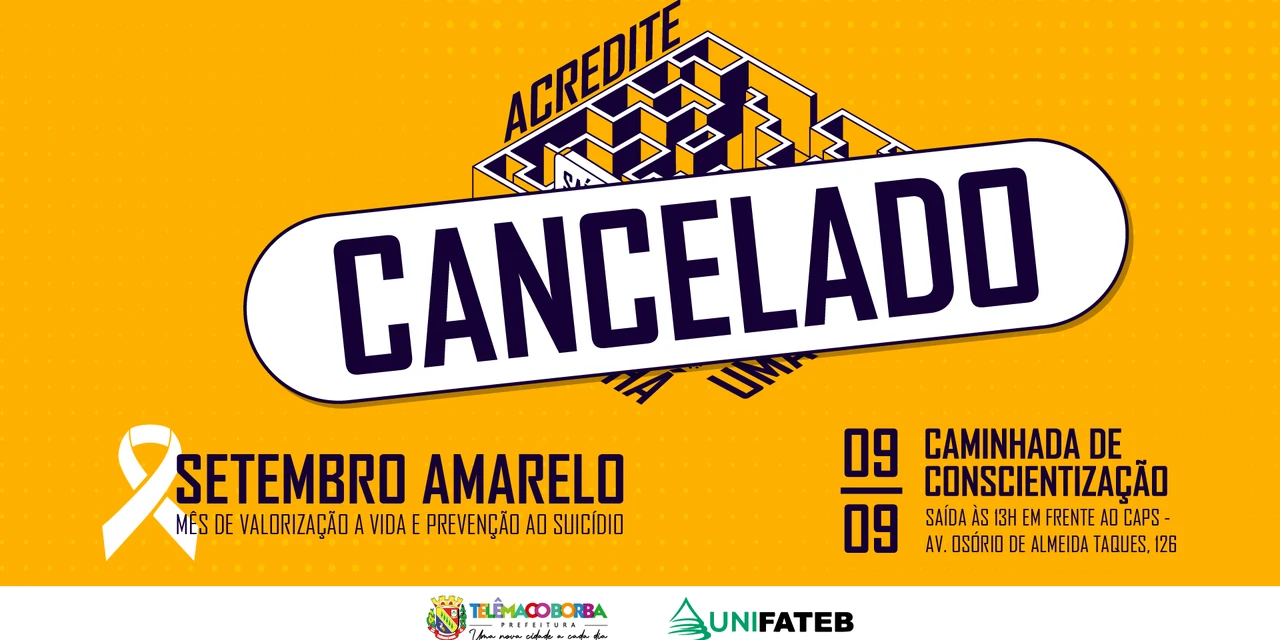 COM ASSESSORIAS - A organização da caminhada em alusão ao Setembro Amarelo informa que a caminhada prevista para acontecer na sexta-feira (09), às 13 horas, foi cancelada.