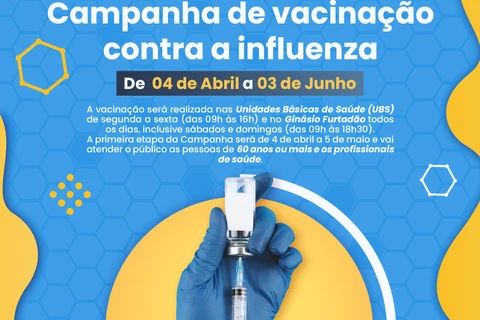 COM ASSESSORIAS - A Secretaria Municipal de Saúde (SMS) inicia a Campanha Nacional de Vacinação contra a Influenza nesta segunda-feira (4). A vacinação segue até o dia 3 e junho e terá o dia D em 30 de abril.