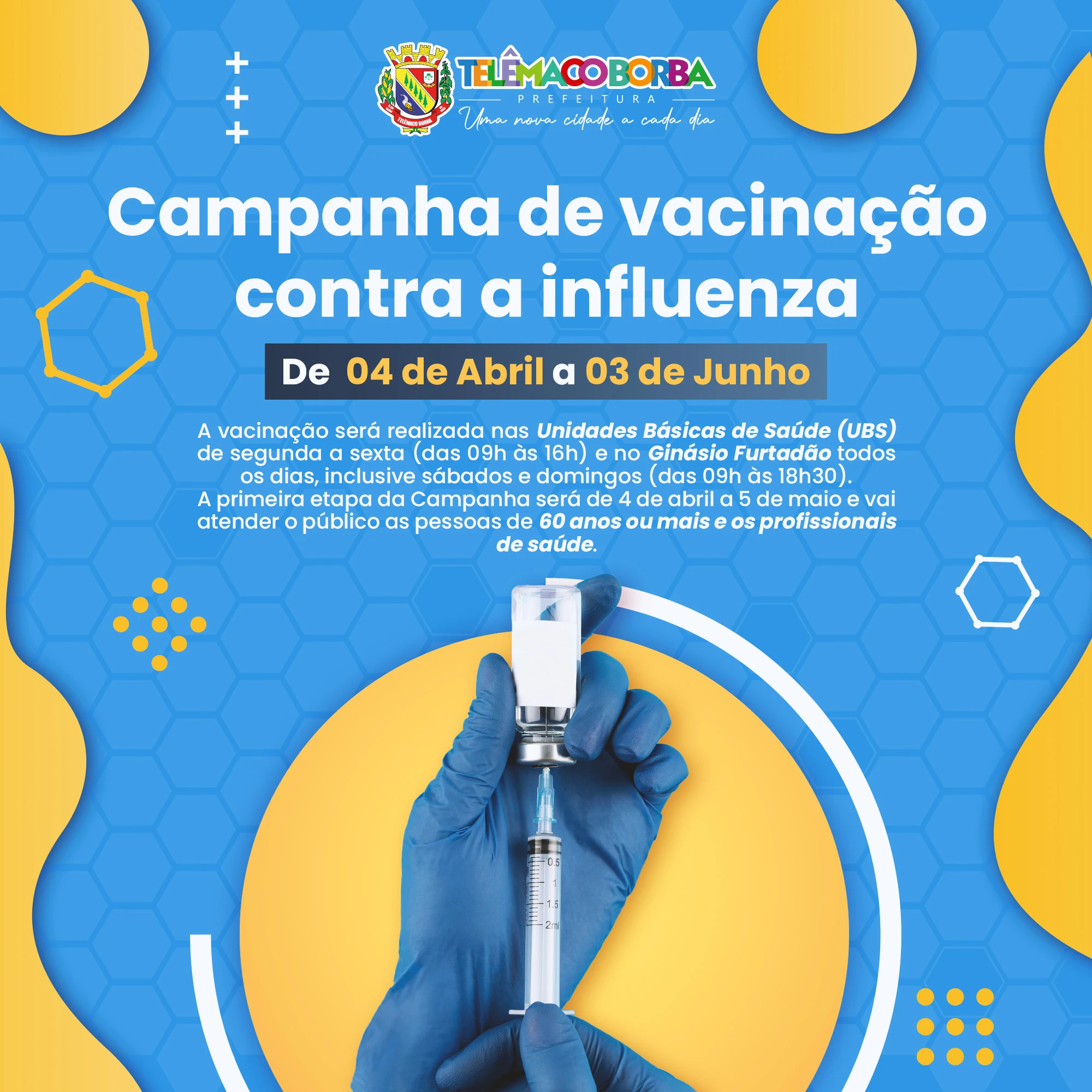 A primeira etapa da Campanha será de 4 de abril a 5 de maio e vai atender o público as pessoas de 60 anos ou mais e os profissionais de saúde.