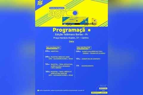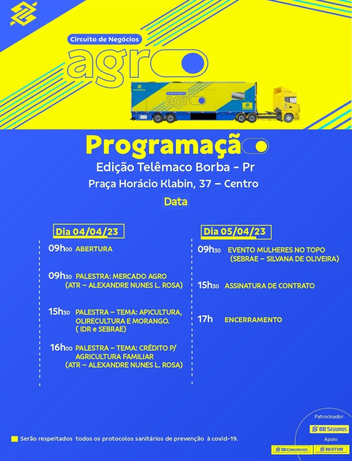 COM ASSESSORIAS - Telêmaco Borba recebe nos dias 04 e 05 de abril a carreta do Circuito de Negócios Agro Banco do Brasil 2023. A veículo ficará na Praça Horácio Klabin, em frente à Prefeitura Municipal.