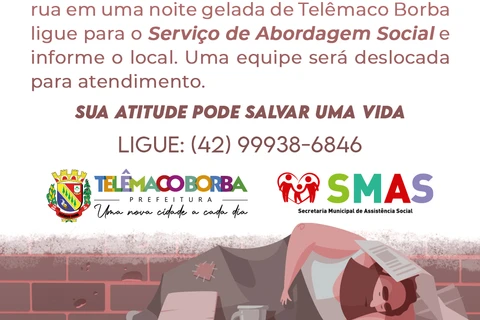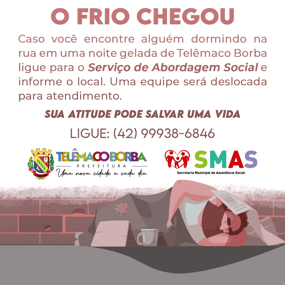 A SMAS solicita à população do Município de Telêmaco Borba para que, além das situações de pessoas em situação de rua, no caso de identificar famílias em situação de vulnerabilidade e que apresentem necessidade de agasalhos e cobertores que, por favor, entrem em contato com os CRAS – Centros de Referência de Assistências Social, nos seguintes telefones: 3904-1556 (CRAS Monte Alegre) ; 3904-1561 (CRAS Cidade Nova); 3904-1643 (CRAS Rio Alegre).