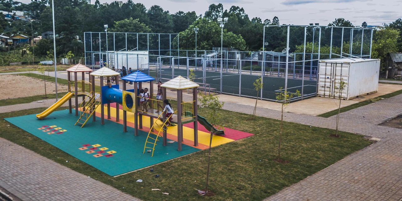 Foram colocados 680 m2 de paver, 650 m2 de grama, oito bancos, 13 luminárias e 100 m2 de piso emborrachado no playground.