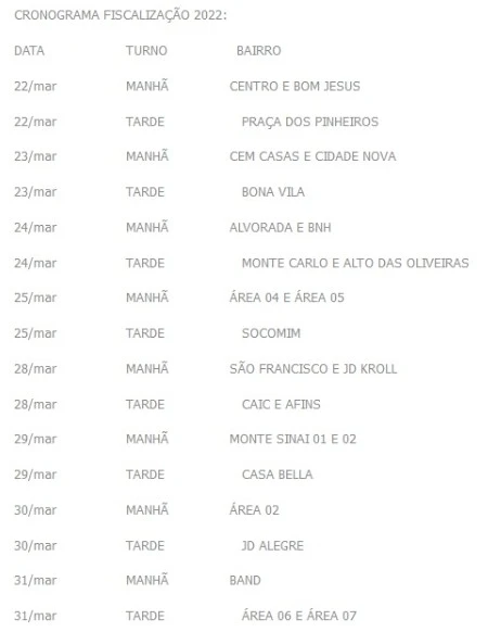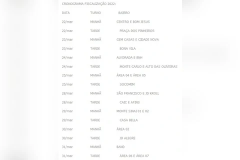 COM ASSESSORIAS - A Secretaria de Planejamento Urbano, Habitação e Meio Ambiente divulga o cronograma de fiscalização do Programa Ação Organização para o mês de março. As ações iniciam no dia 22 nos bairros Centro, Bom Jesus e Praça dos Pinheiros e terminam no dia 31 no Jardim Bandeirantes, Área 06 e Área 07.