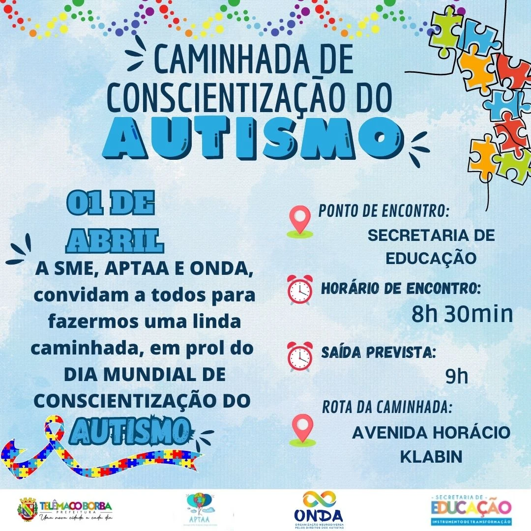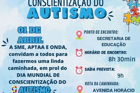 COM ASSESSORIAS - No sábado (1º de abril) será realizada uma Caminhada de Conscientização sobre o Autismo. A concentração será na Secretaria Municipal de Educação (SME) às 8h30 e a saída está programada para as 9 horas.