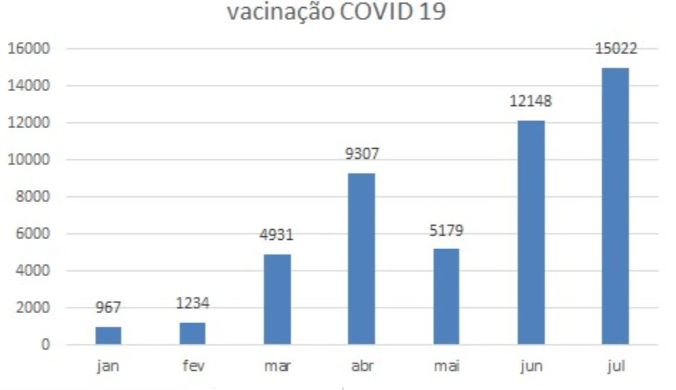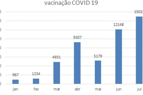 Julho foi o mês que mais foram aplicadas vacinas. Nos 26 dias do atual mês, foram aplicadas 15.022 doses. A média é de 626 vacinas aplicadas diariamente, somente neste mês.