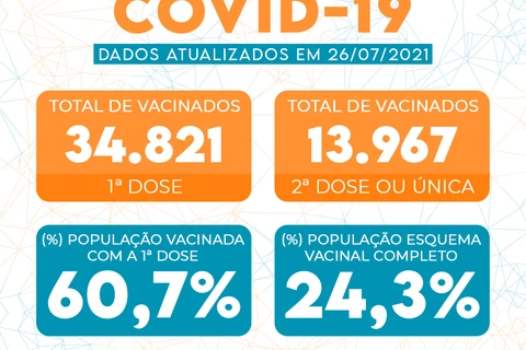 COM ASSESSORIAS - A Secretaria Municipal de Saúde já vacinou em primeira dose 34.821 pessoas, o que equivale a 60,7% do público vacinável. Já em segunda dose ou dose única, em conclusão do esquema vacinal, foram imunizadas 13.967 pessoas, ou seja, 24,3% do público vacinável. A meta do Ministério da Saúde para o município é de vacinar 57.304 da população com 18 aos e mais.