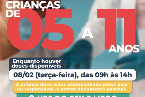COM ASSESSORIAS - A Secretaria Municipal de Saúde (SMS) informa que fará a vacinação das crianças de 05 a 11 anos na terça-feira (08). A vacinação será das 09 às 14 horas, na Unidades Básicas de Saúde (UBS) de referência, enquanto houver doses disponíveis. As UBS's do Triângulo e Socomin não estarão vacinando. As crianças que consultam nestas UBS’s poderão ser vacinadas em qualquer outra UBS.
