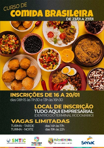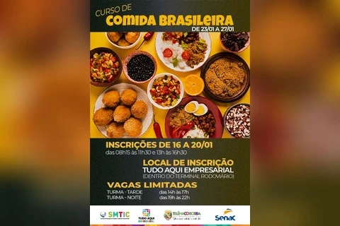 O curso Comida de Brasileira será ministrado pelo SENAC – Serviço Nacional do Comércio, e ocorrerá no período de 23 a 27 de janeiro, em uma cozinha instalada no Terminal Rodoviário, à tarde, das 14h às 17h, e a noite, das 19h às 22h.