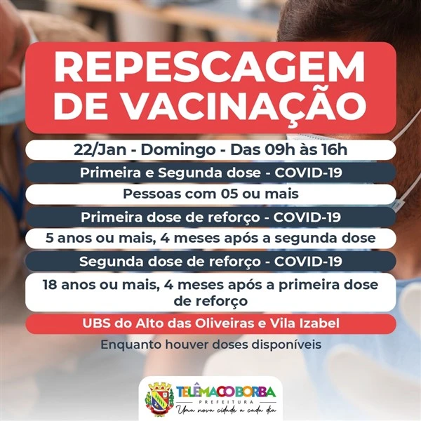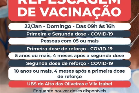 COM ASSESSORIAS - A Secretaria Municipal de Saúde (SMS) vai realizar neste domingo (22) repescagem da vacina contra a Covid-19 nas Unidades Básicas de Saúde (UBSs) do Alto das Oliveiras e Vila Izabel.