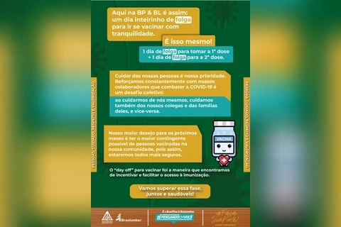 Um folder de vacinação da empresa diz que o dia de folga foi a maneira que as empresas encontraram de incentivar e facilitar o acesso à imunização. “Cuidar das pessoas é nossa prioridade. Reforçamos constantemente com nossos colaboradores que combater a Covid-19 é um desafio coletivo: ao cuidarmos de nós mesmos, cuidamos também de nossos colegas e das famílias deles”, diz o folder.