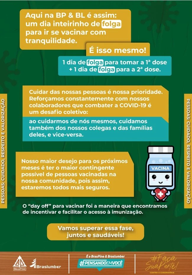 COM ASSESSORIAS A Secretaria Municipal de Saúde parabeniza as empresas Braslumber e Braspine pela iniciativa de dar o dia de folga para que seus colaboradores tomem a vacina contra a Covid-19. A ação prevê que no dia que for vacinar, o funcionário não precisa trabalhar. A folga vale para primeira e segunda dose e serve como incentivo para que os funcionários sejam imunizados.