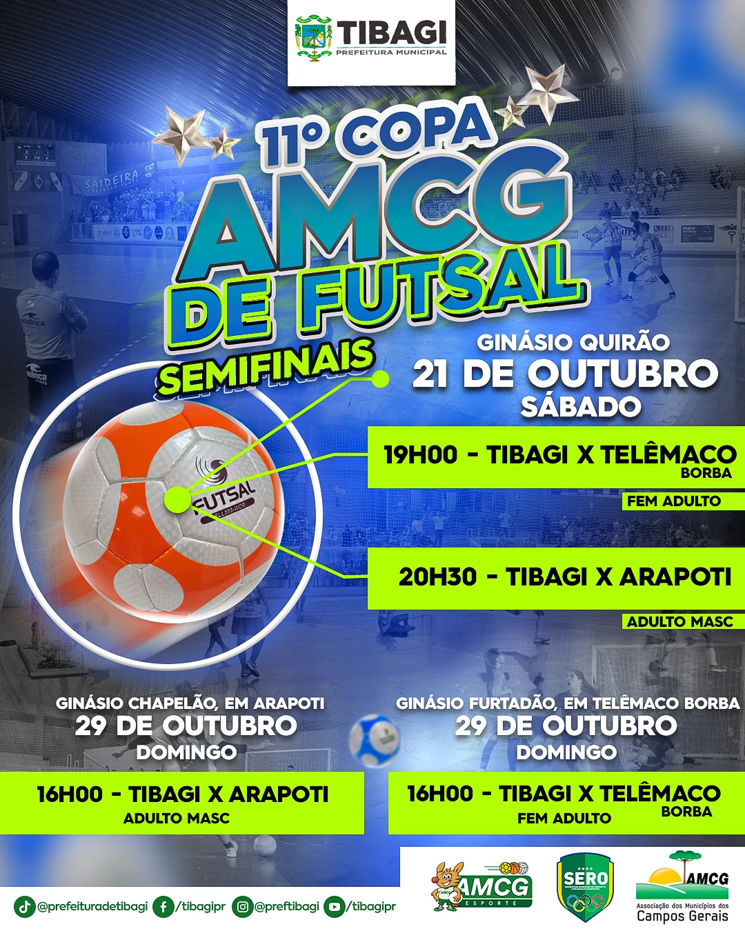 COM ASSESSORIAS - AS equipes de futsal masculina e feminina de Tibagi se classificaram para as semifinais da 11ª Copa AMCG da modalidade. O mata-mata será disputado em jogos de ida e volta e as primeiras partidas acontecem no Ginásio Quirão no dia 21 de outubro (próximo sábado) a partir das 19h.
