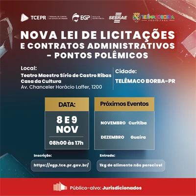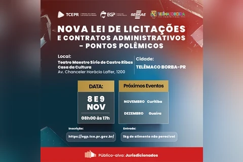 COM ASSESSORIAS - A Escola de Gestão Pública, em parceria com a Prefeitura Municipal, TCE-PR e Sebrae, realiza nos dias 08 e 09 de novembro, no Teatro Maestro Sirinho, o curso “Nova Lei de Licitações e Contratos Administrativos – Pontos Polêmicos”.