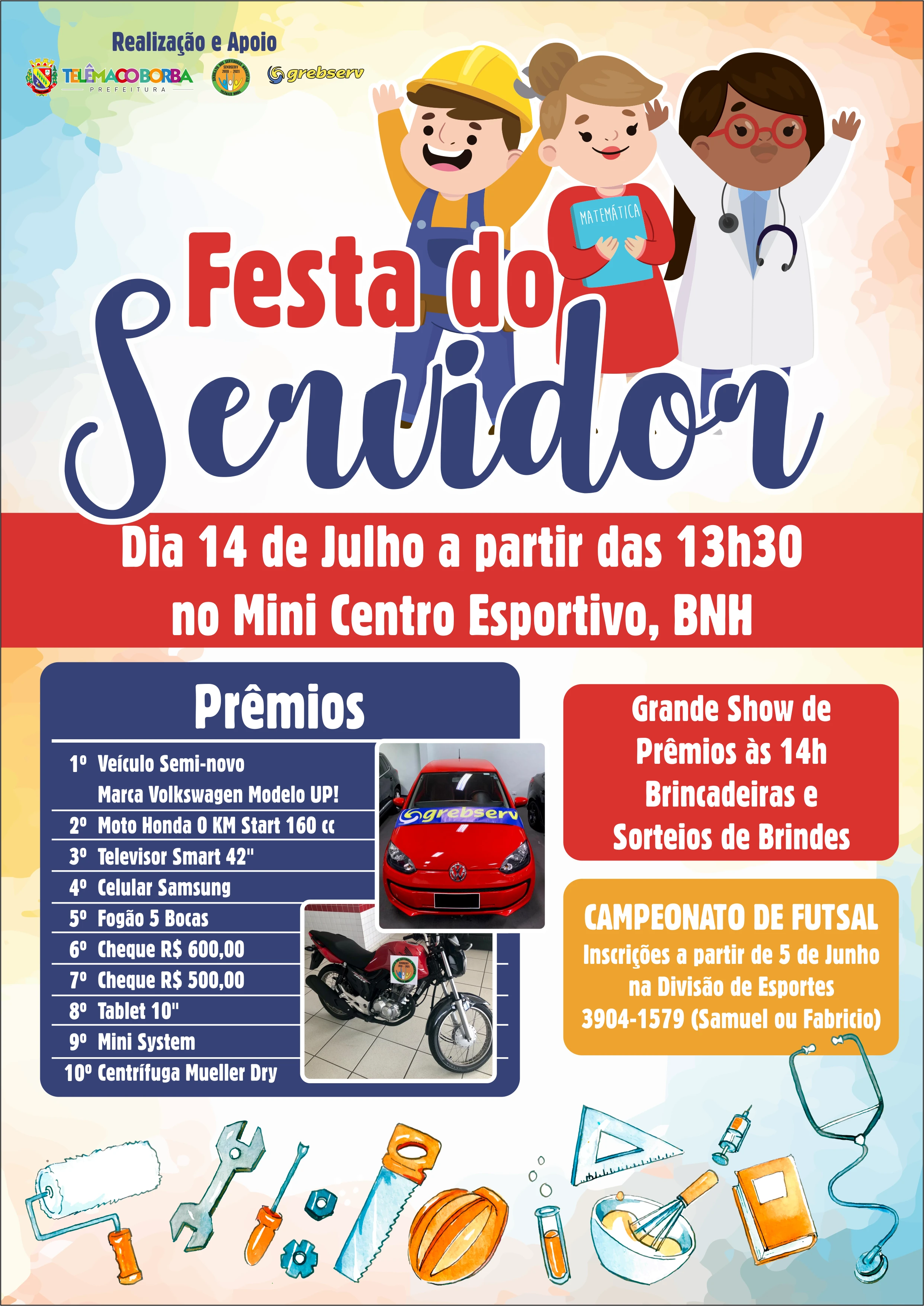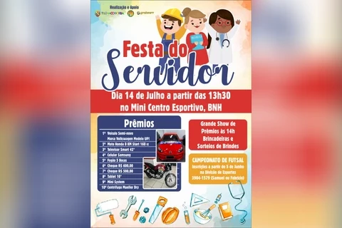 IMPRENSA/Telêmaco Borba - A Administração Municipal, com apoio do Grebserv – Grêmio Beneficente dos Servidores Municipais de Telêmaco Borba e do Sindserv – Sindicato dos Servidores Municipais, realizará no dia 14 de julho (domingo), a partir das 13h30, no Estádio Municipal Péricles Pacheco da Silva (Minicentro), bairro BNH, a Festa do Servidor.
