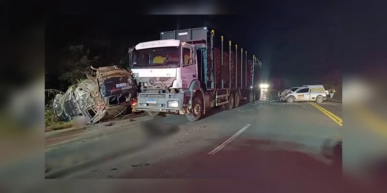 Uma gestante e outra mulher morreram e uma criança e dois homens ficaram feridos após um grave acidente envolvendo dois carros e um caminhão na PR-340, em Telêmaco Borba, nos Campos Gerais.