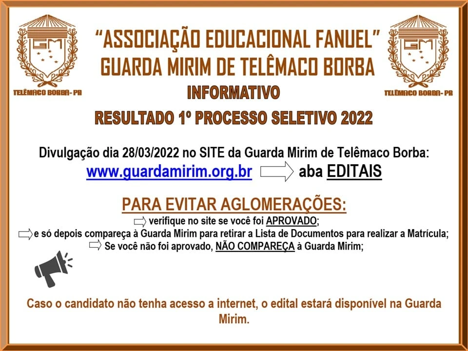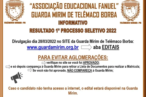 COM ASSESSORIAS - A Associação Educacional Fanuel – Guarda Mirim de Telêmaco Borba divulgou, na manhã desta segunda-feira (28), o resultado Final do 1º Processo Seletivo 2022.