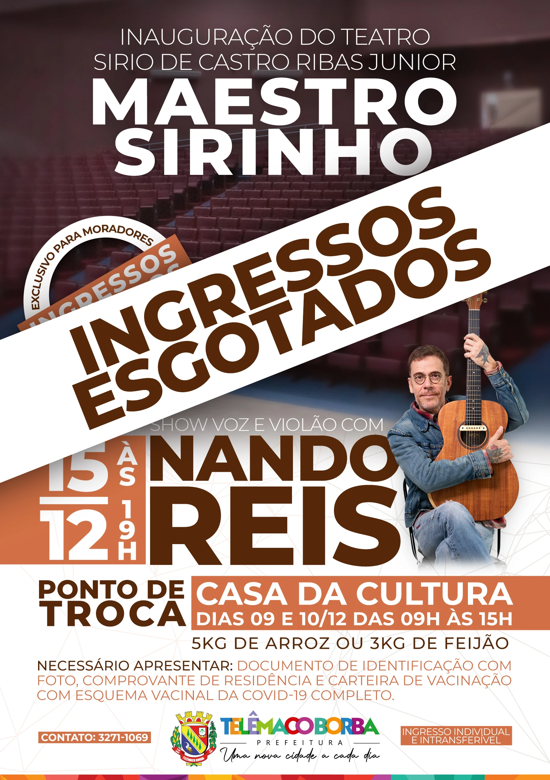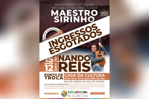 COM ASSESSORIAS - A Prefeitura Municipal de Telêmaco Borba informa que estão esgotados os ingressos para o show do Nando Reis, que acontecerá na quarta-feira (15), às 19 horas, como evento de inauguração do teatro Sírio de Castro Ribas Junior (Maestro Sirinho).