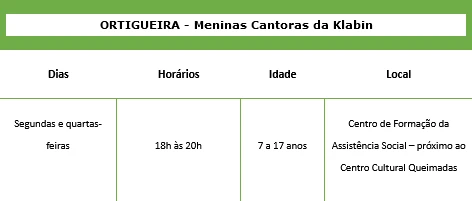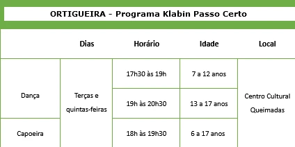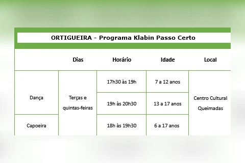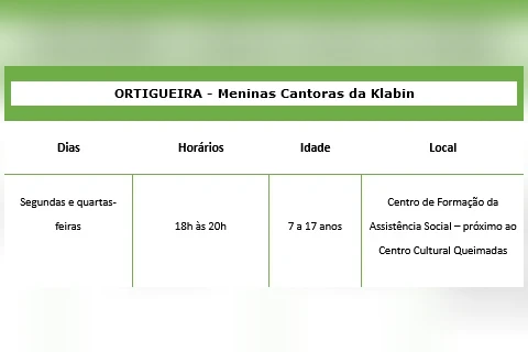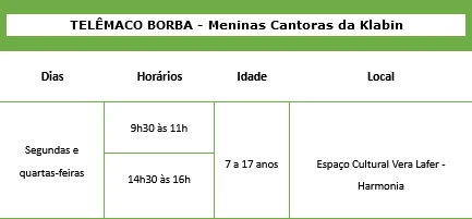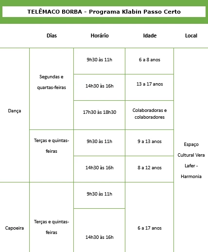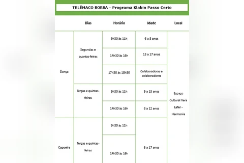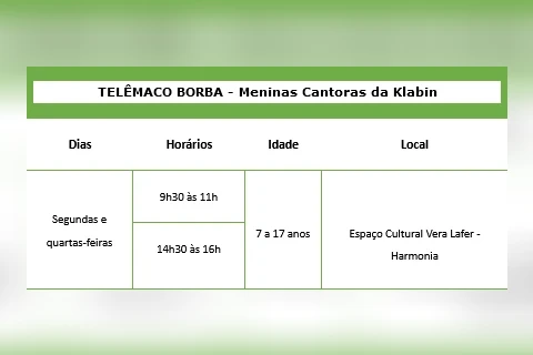 No programa Meninas Cantoras da Klabin, as participantes terão aulas de canto coral, enquanto no Klabin Passo Certo, os alunos poderão praticar dança ou capoeira. As inscrições podem ser realizadas por meio do